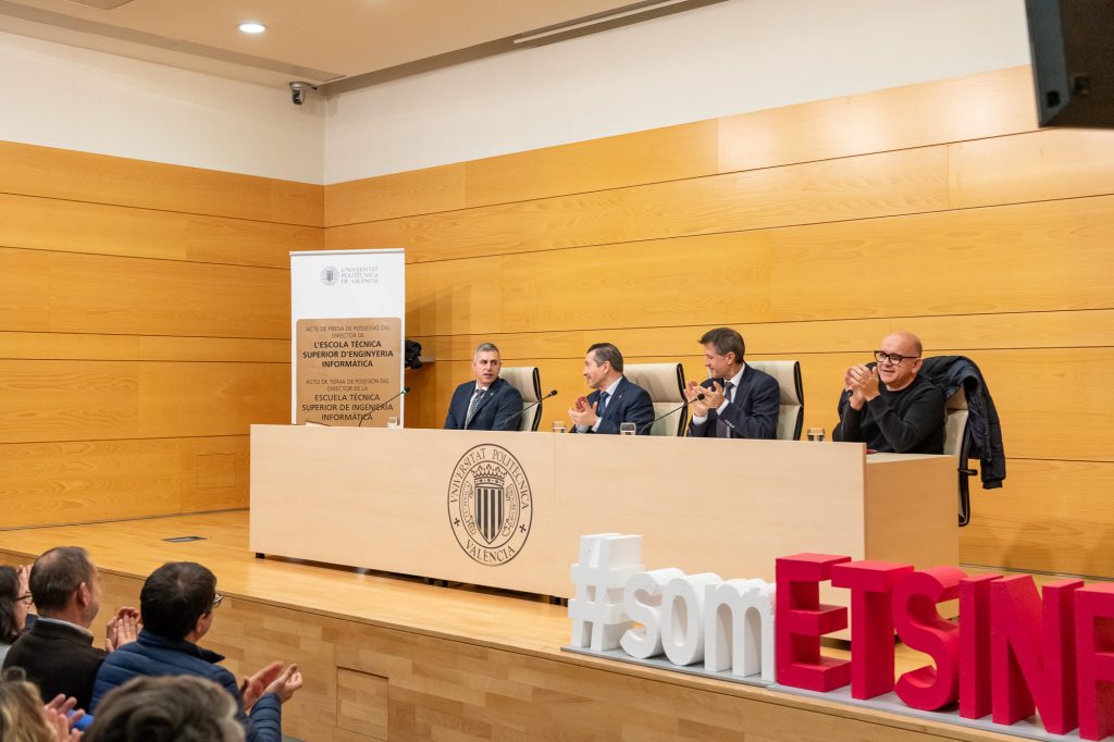 El acto se celebró en el salón de Actos Alan Turing y estuvo presidido por el rector de la UPV, José Capilla junto al secretario de la UPV, Josep Antoni Claver y el director saliente Vicente Pelechano. El relevo en la dirección marca el inicio de una nueva etapa para la ETSINF, con ilusión y responsabilidad ante los desafíos de la gestión del centro.